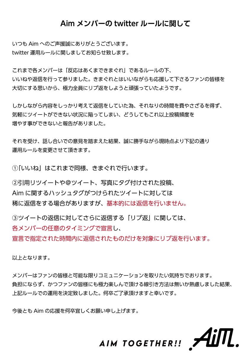 【お知らせ】Aimメンバーのtwitter運用ルール変更のお知らせです。ファンの皆様のご理解とご協力を何卒お願い申し上げます。